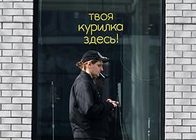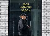 Жанровая фотография. Мужчина с сигаретой на фоне надписи "Твоя курилка здесь!".