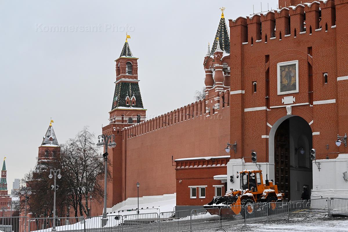 Виды Москвы. Жанровая фотография. Сотрудники коммунальной службы города во время уборки снега на Красной площади. Трактор у ворот Спасской башни.