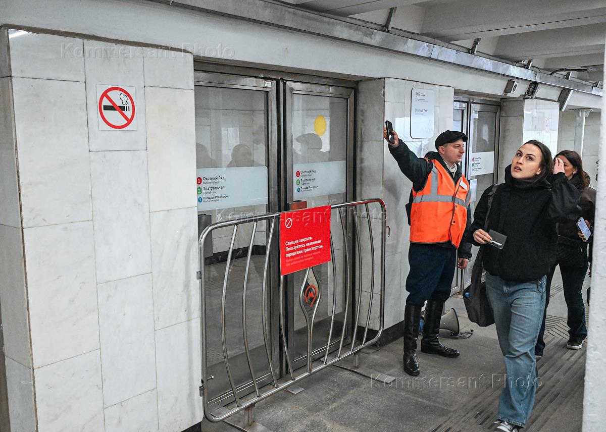 Ситуация в Московском метрополитене. Движение поездов на участке Сокольнической линии метро от станции "Парк культуры" до станции "Бульвар Рокоссовского" было прервано из-за задымления. Сотрудник метрополитена на пропускает пассажиров на станцию "Охотный ряд".