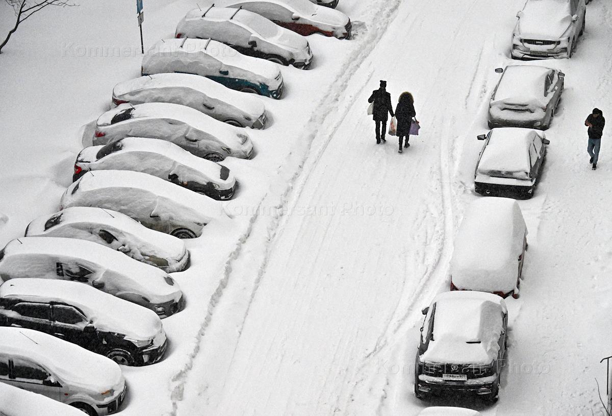 Виды Москвы во время снегопада. Жанровая фотография. Автомобили, засыпанные снегом, на парковке.