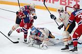 Континентальная Хоккейная Лига (КХЛ). Матч между командами ЦСКА (Москва) - "Шанхайские Драконы" (Шанхай) на стадионе "ЦСКА Арена". Игрок команды "Шанхайские Драконы" Джейк Бишофф (слева) и игрок команды ЦСКА Денис Гурьянов (справа) во время матча.