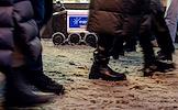 Жанровая фотография. Люди на улице города. Робот-доставщик на улице.