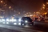 Виды Москвы во время снегопада. Жанровая фотография. Дорожное движение на одной из улиц города.