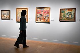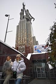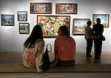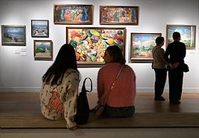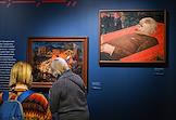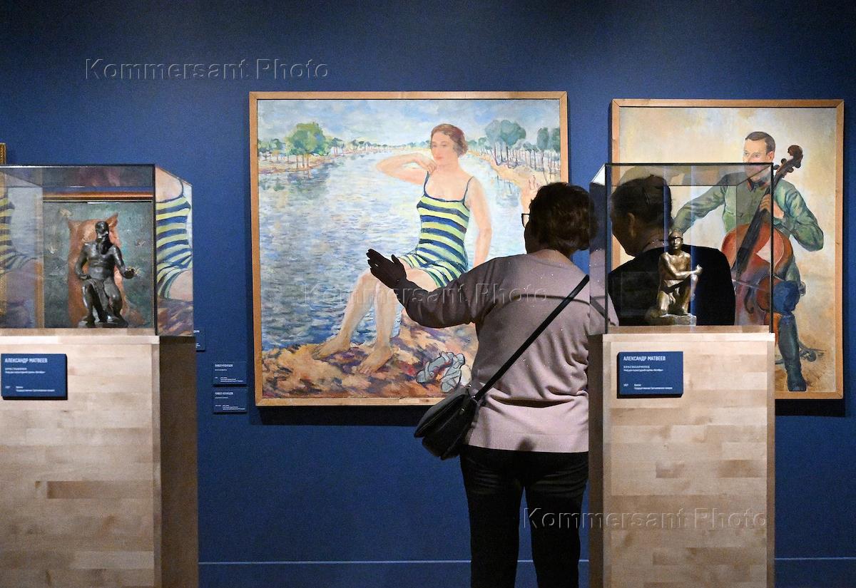 Выставка "Волга. Москва. Нева. Саратовские символисты в Москве и Ленинграде 1920–1940-х" в павильоне "Рабочий и колхозница" на ВДНХ. Посетители на выставке.