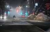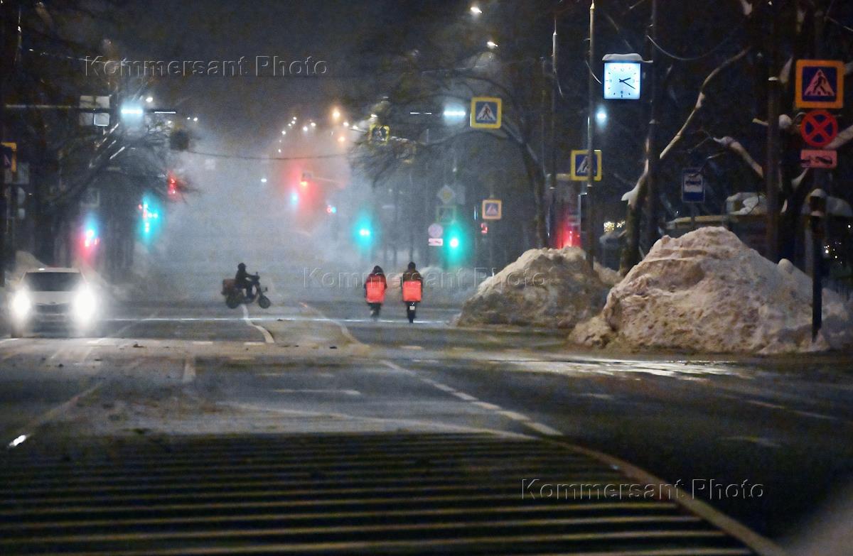 Виды Москвы. Жанровая фотография. Курьеры на электровелосипедах на проезжей части во время тумана.