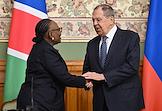 Переговоры министра иностранных дел России Сергея Лаврова с министром международных отношений и торговли Намибии Сельмой Ашипалой-Мусавьи в Доме приемов МИД России. Министр иностранных дел России Сергей Лавров (в центре) и министр международных отношений и торговли Намибии Сельма Ашипала-Мусавьи (слева) перед началом переговоров.