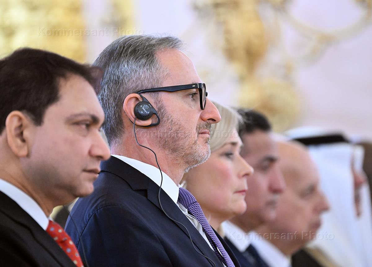 Церемония вручения верительных грамот вновь прибывшими послами иностранных государств президенту России Владимиру Путину в Александровском зале Большого Кремлевского дворца. Слева направо: посол Бангладеш в России Назрул Ислам, посол Бразилии в России Сержио Родригес Дос Сантос и посол Норвегии в России Хейди Олуфсен во время церемонии.