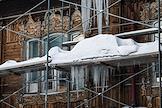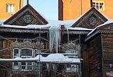 Виды Новосибирска. Жанровая фотография. Сосульки свисают с крыши старого дома.
