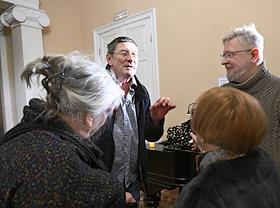 Презентация аудиоверсии книги журналиста ИД "Коммерсантъ" Екатерины Истоминой "Пионерское время" в доме-музее Станиславского. Справа налево: руководитель группы иностранной информации Николай Зубов, издатель Андрей Ирбит, мама Екатерины Истоминой, художник Людмила Истомина и журналист Сергей Тополь во время презентации.