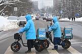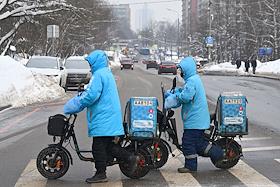Виды Москвы. Жанровая фотография. Курьеры службы доставки "Яндекс. Лавка" с электровелосипедами переходят проезжую часть дороги по пешеходному переходу.