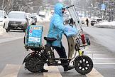 Виды Москвы. Жанровая фотография. Курьер службы доставки "Яндекс. Лавка" с электровелосипедом переходит проезжую часть дороги по пешеходному переходу.