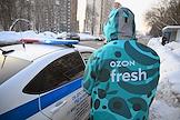 Профилактическое мероприятие "Велокурьер", проводимое сотрудниками Госавтоинспекции Юго-Западного административного округа Москвы. Жанровая фотография. Курьер службы доставки "OZON. fresh" у автомобиля дорожно-патрульной службы (ДПС).
