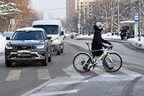 Виды Москвы. Жанровая фотография. Велосипедист переходит проезжую часть дороги по пешеходному переходу.