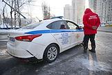 Профилактическое мероприятие "Велокурьер", проводимое сотрудниками Госавтоинспекции Юго-Западного административного округа Москвы. Жанровая фотография. Курьер службы доставки "Магнит. Доставка" у автомобиля дорожно-патрульной службы (ДПС).