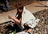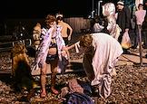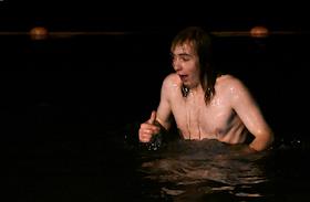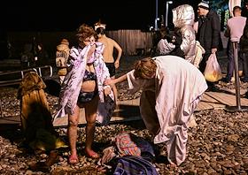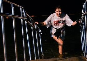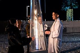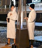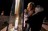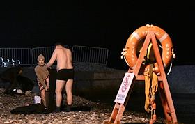 Праздник Крещения Господня (Богоявления). Крещенские купания на пляже Черного моря. Люди греются у газового обогревателя после купания.