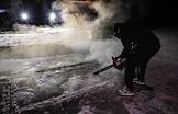 Праздник Крещения Господня (Богоявления). Крещенские купания на реке Волге. Мужчина бензопилой делает прорубь для купаний во льду.