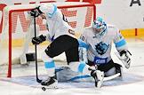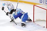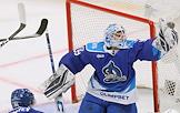 Континентальная Хоккейная Лига (КХЛ). Матч между командами "Динамо" (Москва) - "Динамо Минск" (Минск) на стадионе "ВТБ Арена". Вратарь команды "Динамо Минск" Закари Фукале (справа) во время матча.