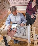 Выставка "Русская традиция" в Русском музее (корпус Бенуа). Вышивальщица во время мастер-класса.