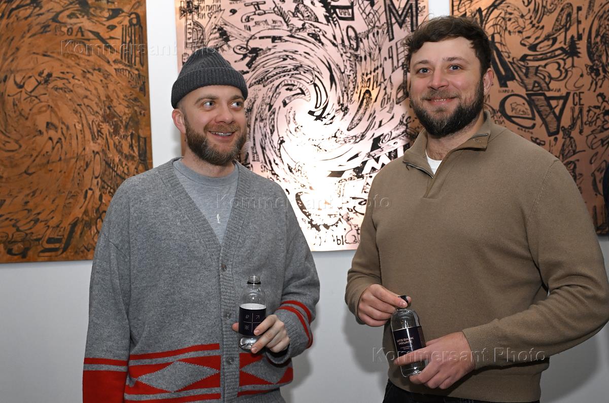 Церемония открытия выставок "Ребус" художника Сергея Бугаева ("Африка") и "Go. Went. Gone." Southside Grooven в SISTEMA GALLERY. Художник Александр Петрелли (слева) на церемонии.