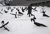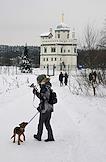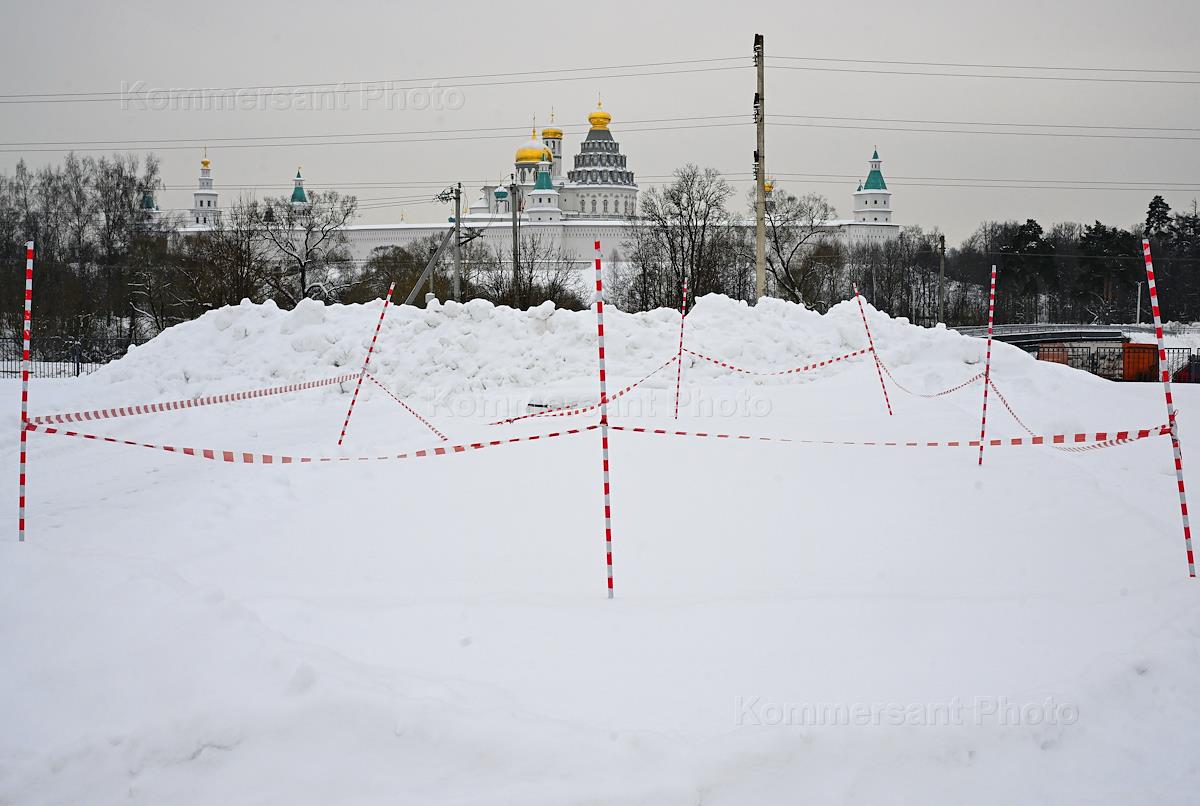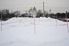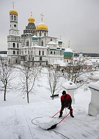 Воскресенский Новоиерусалимский ставропигиальный мужской монастырь. Воскресенский собор. Жанровая фотография. Рабочий чистит от снега крышу служебной постройки.