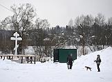 Воскресенский Новоиерусалимский ставропигиальный мужской монастырь. Поклонный крест у купели на реке Истре. Жанровая фотография.