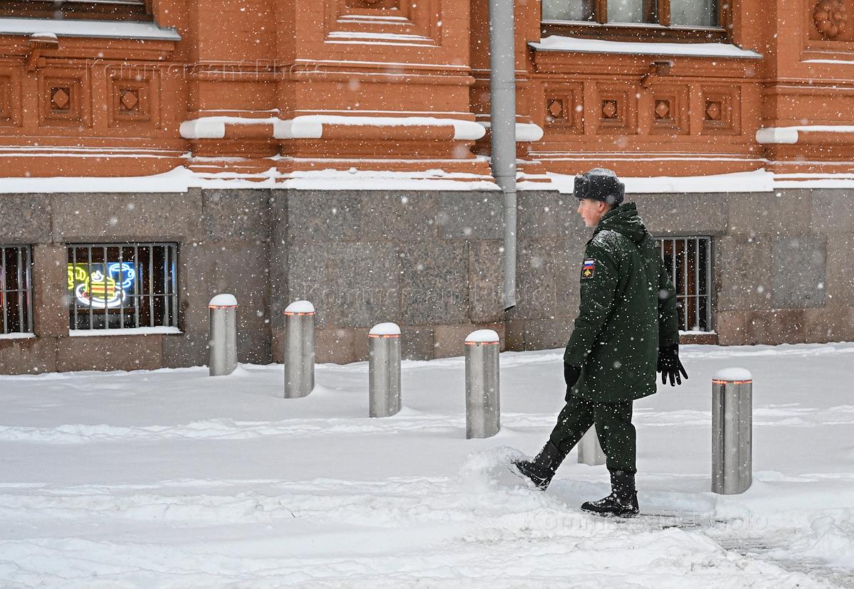 Виды Москвы во время снегопада. Жанровая фотография. Военнослужащий на Красной площади во время снегопада.