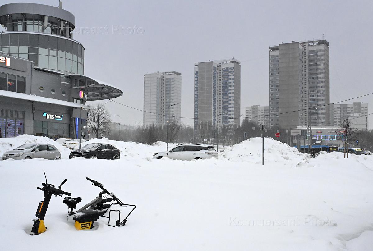 Виды Москвы. Жанровая фотография. Снегопад в городе. Сугробы на Юго-Западе города на проспекте Вернадского.
