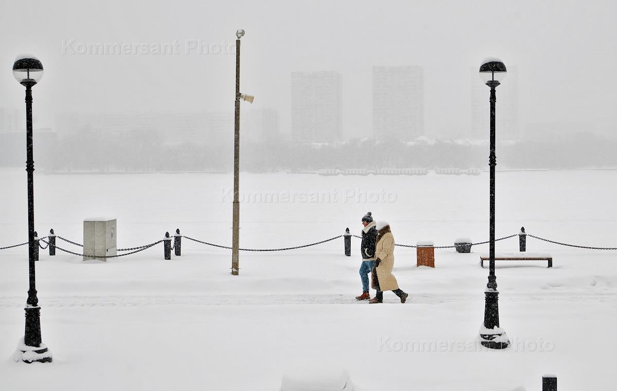Снегопад в Москве. Жанровая фотография. Молодые люди во время прогулки на территории Северного речного вокзала.