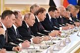 Переговоры президента России Владимира Путина с президентом Объединенных Арабских Эмиратов (ОАЭ) Мухаммедом Бен Заидом Аль Нахайяном в Большом Кремлевском дворце. Слева направо: заместитель руководителя администрации президента России Максим Орешкин, заместитель председателя правительства России Дмитрий Патрушев, министр иностранных дел России Сергей Лавров, президент России Владимир Путин и первый заместитель председателя правительства России Денис Мантуров во время переговоров.