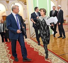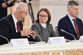 Переговоры президента России Владимира Путина с президентом Объединенных Арабских Эмиратов (ОАЭ) Мухаммедом Бен Заидом Аль Нахайяном в Большом Кремлевском дворце. Слева направо: генеральный директор Российского фонда прямых инвестиций, специальный представитель президента России по инвестиционно-экономическому сотрудничеству с зарубежными странами Кирилл Дмитриев, председатель Центрального Банка России Эльвира Набиуллина и министр экономического развития России Максим Решетников перед началом переговоров.