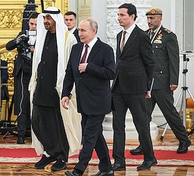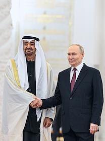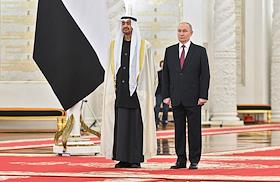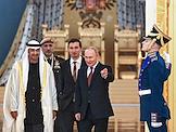 Переговоры президента России Владимира Путина с президентом Объединенных Арабских Эмиратов (ОАЭ) Мухаммедом Бен Заидом Аль Нахайяном в Большом Кремлевском дворце. Президент ОАЭ Мухаммед Бен Заид Аль Нахайян (слева) и президент России Владимир Путин (в центре) на церемонии официальной встречи перед началом переговоров.