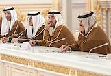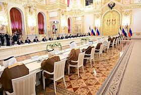 Переговоры президента России Владимира Путина с президентом Объединенных Арабских Эмиратов (ОАЭ) Мухаммедом Бен Заидом Аль Нахайяном в Большом Кремлевском дворце. Члены делегации ОАЭ во время переговоров.