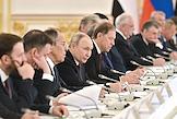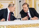 Переговоры президента России Владимира Путина с президентом Объединенных Арабских Эмиратов (ОАЭ) Мухаммедом Бен Заидом Аль Нахайяном в Большом Кремлевском дворце. Президент России Владимир Путин (слева) и первый заместитель председателя правительства России Денис Мантуров (справа) во время переговоров.