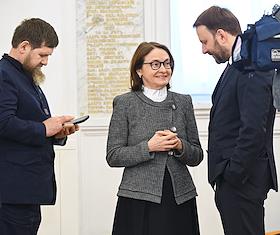 Переговоры президента России Владимира Путина с президентом Объединенных Арабских Эмиратов (ОАЭ) Мухаммедом Бен Заидом Аль Нахайяном в Большом Кремлевском дворце. Слева направо: глава Чеченской Республики Рамзан Кадыров, председатель Центрального Банка России Эльвира Набиуллина и заместитель руководителя администрации президента России Максим Орешкин перед началом переговоров.