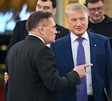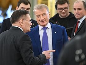 Переговоры президента России Владимира Путина с президентом Объединенных Арабских Эмиратов (ОАЭ) Мухаммедом Бен Заидом Аль Нахайяном в Большом Кремлевском дворце. Президент, председатель правления Сбербанка России Герман Греф (слева) и генеральный директор АО "Российский экспортный центр" Вероника Никишина (в центре) перед началом переговоров.