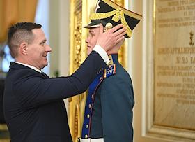 Переговоры президента России Владимира Путина с президентом Объединенных Арабских Эмиратов (ОАЭ) Мухаммедом Бен Заидом Аль Нахайяном в Большом Кремлевском дворце. Слева направо: начальник Главного управления Генерального штаба ВС России - заместитель начальника Генерального штаба ВС России Игорь Костюков, глава Чеченской Республики Рамзан Кадыров, председатель Либерально-демократической партии России (ЛДПР), руководитель фракции ЛДПР в Государственной думе России Леонид Слуцкий, генеральный директор Российского фонда прямых инвестиций, специальный представитель президента России по инвестиционно-экономическому сотрудничеству с зарубежными странами Кирилл Дмитриев, президент ОАЭ Мухаммед Бен Заид Аль Нахайян, президент России Владимир Путин на церемонии официальной встречи перед началом переговоров.