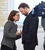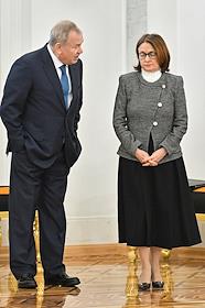 Переговоры президента России Владимира Путина с президентом Объединенных Арабских Эмиратов (ОАЭ) Мухаммедом Бен Заидом Аль Нахайяном в Большом Кремлевском дворце. Председатель Центрального Банка России Эльвира Набиуллина (слева) и заместитель руководителя администрации президента России Максим Орешкин (справа) перед началом переговоров.