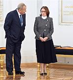Переговоры президента России Владимира Путина с президентом Объединенных Арабских Эмиратов (ОАЭ) Мухаммедом Бен Заидом Аль Нахайяном в Большом Кремлевском дворце. Председатель Центрального Банка России Эльвира Набиуллина (в центре) перед началом переговоров.