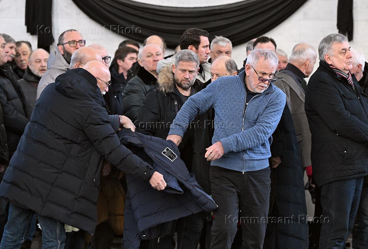 Церемония прощания с бывшим главным тренером сборной России по футболу Борисом Игнатьевым в Большом траурном зале Троекуровского кладбища. Почетный президент футбольного клуба "Динамо-Махачкала" Гаджи Гаджиев (третий справа) во время церемонии.
