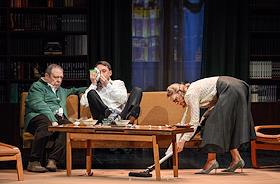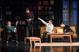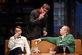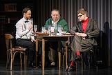 Премьера спектакля "Имя" французских драматургов Александра де ла Пательера и Матьё Делапорта в постановке режиссеров Сергея Кальварского и Натальи Капустиной в Театре эстрады. Слева направо: актеры Эльдар Калимулин, Андрей Максимов и Александр Семчев во время спектакля.