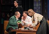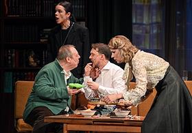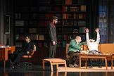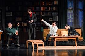 Премьера спектакля "Имя" французских драматургов Александра де ла Пательера и Матьё Делапорта в постановке режиссеров Сергея Кальварского и Натальи Капустиной в Театре эстрады. Слева направо: актеры Софья Аржаных, Андрей Максимов, Александр Семчев и Александра Ребенок во время спектакля.
