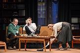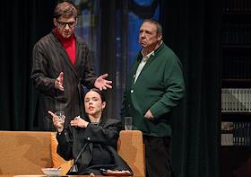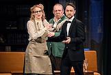 Премьера спектакля "Имя" французских драматургов Александра де ла Пательера и Матьё Делапорта в постановке режиссеров Сергея Кальварского и Натальи Капустиной в Театре эстрады. Слева направо: актеры Александр Семчев, Эльдар Калимулин и Александра Ребенок во время спектакля.