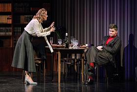 Премьера спектакля "Имя" французских драматургов Александра де ла Пательера и Матьё Делапорта в постановке режиссеров Сергея Кальварского и Натальи Капустиной в Театре эстрады. Актеры Александра Ребенок (слева) и Александр Семчев во время спектакля.