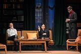 Премьера спектакля "Имя" французских драматургов Александра де ла Пательера и Матьё Делапорта в постановке режиссеров Сергея Кальварского и Натальи Капустиной в Театре эстрады. Слева направо: актеры Андрей Максимов, Софья Аржаных и Александр Семчев во время спектакля.