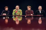 Пресс-конференция, посвященная гастролям театра "Коляда-Театр", в Театральном центре "На Страстном. Слева направо: актриса Тамара Зимина, драматург, директор и художественный руководитель "Коляда-Театра", режиссер Николай Коляда, актер, лидер группы "Курара" Олег Ягодин и актер Сергей Федоров во время пресс-конференции.