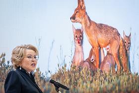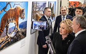 Церемония открытия фотовыставки в рамках XIII Общероссийского фестиваля природы "Первозданная Россия" 2026 года в Центральном выставочном зале "Манеж". Председатель Совета Федерации России Валентина Матвиенко на церемонии.