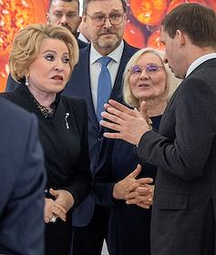 Церемония открытия фотовыставки в рамках XIII Общероссийского фестиваля природы "Первозданная Россия" 2026 года в Центральном выставочном зале "Манеж". Председатель Совета Федерации России Валентина Матвиенко (слева) и заместитель председателя Совета Федерации России Константин Косачев (в центре) на церемонии.