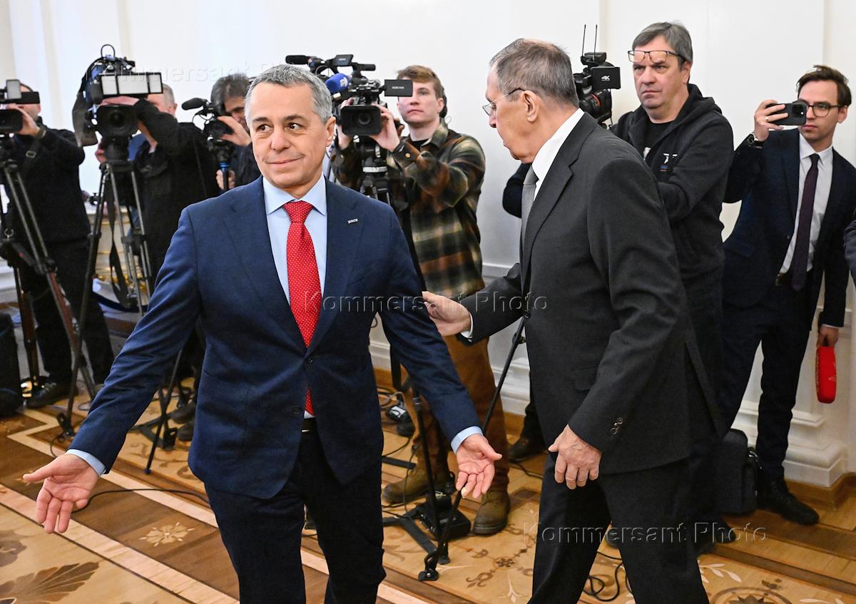 Переговоры министра иностранных дел России Сергея Лаврова с действующим председателем ОБСЕ, начальником Федерального департамента иностранных дел Швейцарской Конфедерации Иньяцио Кассисом и генеральным секретарем ОБСЕ Феридуном Синирлиоглу в Доме приемов МИД России. Министр иностранных дел России Сергей Лавров (в центре, справа) и председатель ОБСЕ, начальник Федерального департамента иностранных дел Швейцарской Конфедерации Иньяцио Кассис (в центре слева) перед началом переговоров.