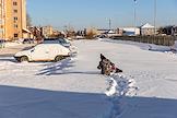 Виды Белоярского городского округа. Жанровая фотография. Человек идет по улице по колено в снегу.