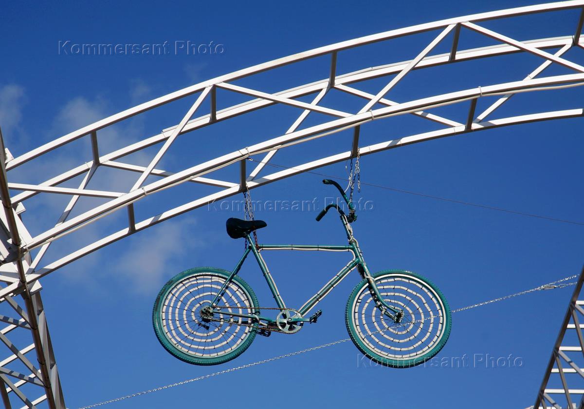 Виды Волжского. Жанровая фотография. Велосипед как часть декоративной конструкции на территории торгово-развлекательного квартала Французский бульвар в центре города.